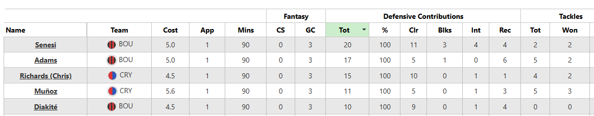 There are five in all, including the DefCon poster Mark Senesi (£5.0 million). Chris Richards (£4.5m) is the first Palace defender to reach double figures in DefCon points in 2025/26.