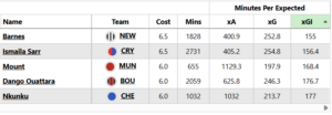 Above: Harvey Barnes was the leading £6.5m-and-under midfielder for minutes per xGI last season (min. 1000 minutes). He’s worthy of serious FPL consideration when given a run in the XI, as he was towards the back-end of last season when Anthony Gordon was injured, but right now, there’s too much competition – even more so with Jacob Ramsey (£5.5m) imminent.