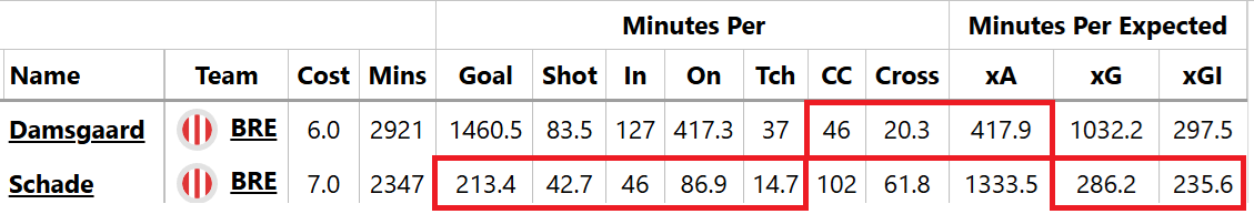 Schade actually racked up more open-play xG than Mbeumo last season, and averaged 5.0 points per start compared to Damsgaard’s 3.7 – although the Dane would have elevated that to 4.1 with defensive contributions.