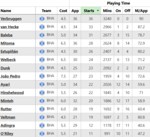 Georginio Rutter (£6.0m) has early-season ‘out of position’ potential up top. Yankuba Minteh (£6.0m) has looked sharped in pre-season and should start the campaign on the right. But just 20 starts for the latter underscores his relative insecurity, with Hurzeler fond of pointing out his deficiencies from time to time.