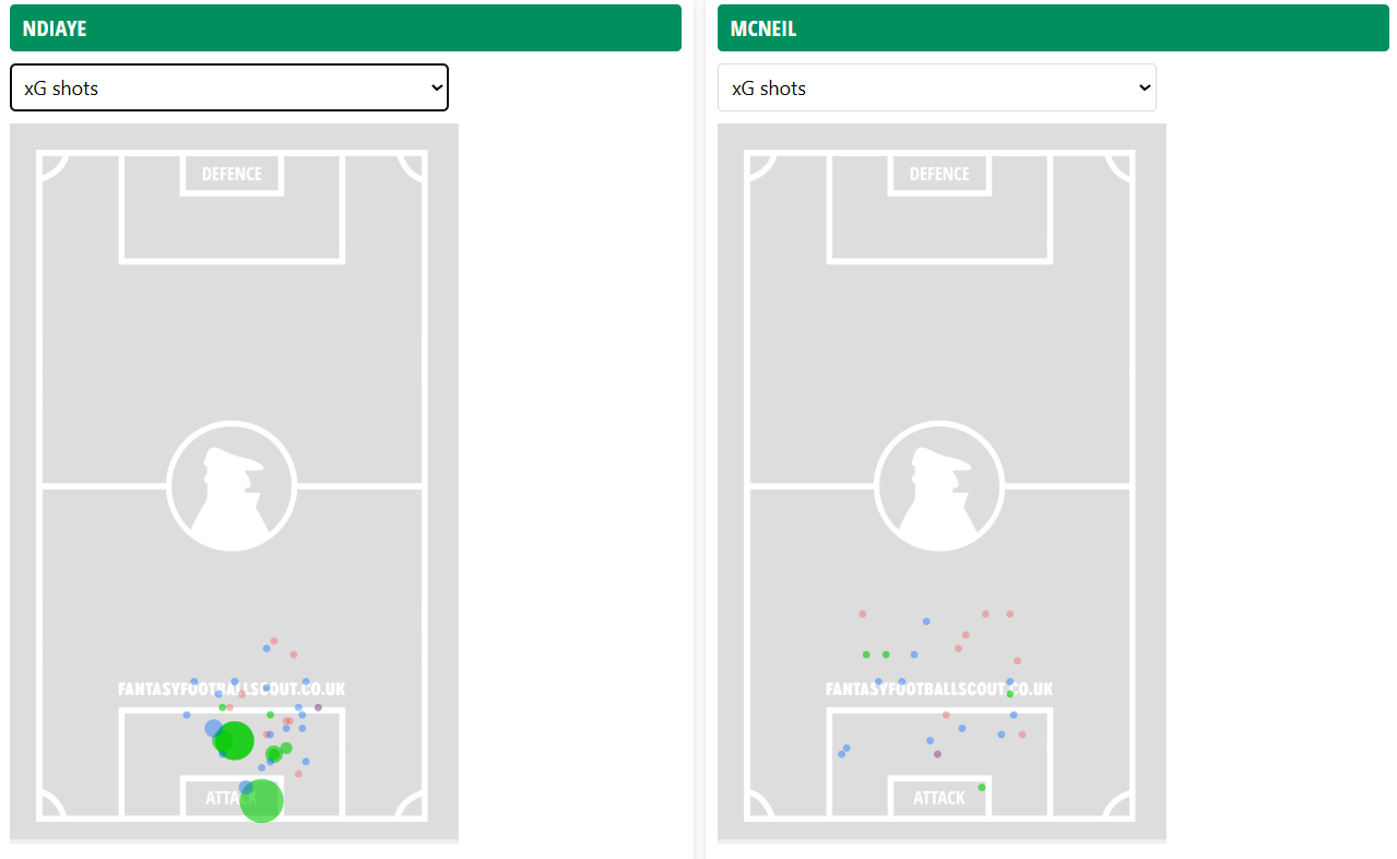 Above: The xG shotmaps of Ndiaye and McNeil last season, with bigger circles representing better chances. Green = goal