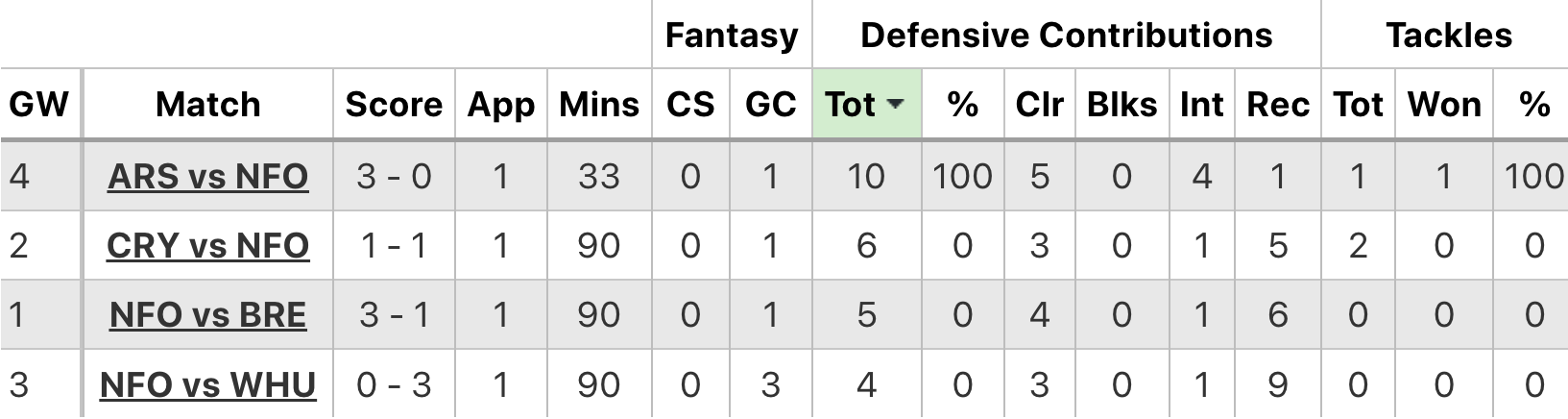 Above: Murillo’s (Tot) defensive contributions ranked by Gameweek in 2025/26