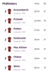 Above: Liverpool midfielders ranked by FPL points in Matchweeks 1-7