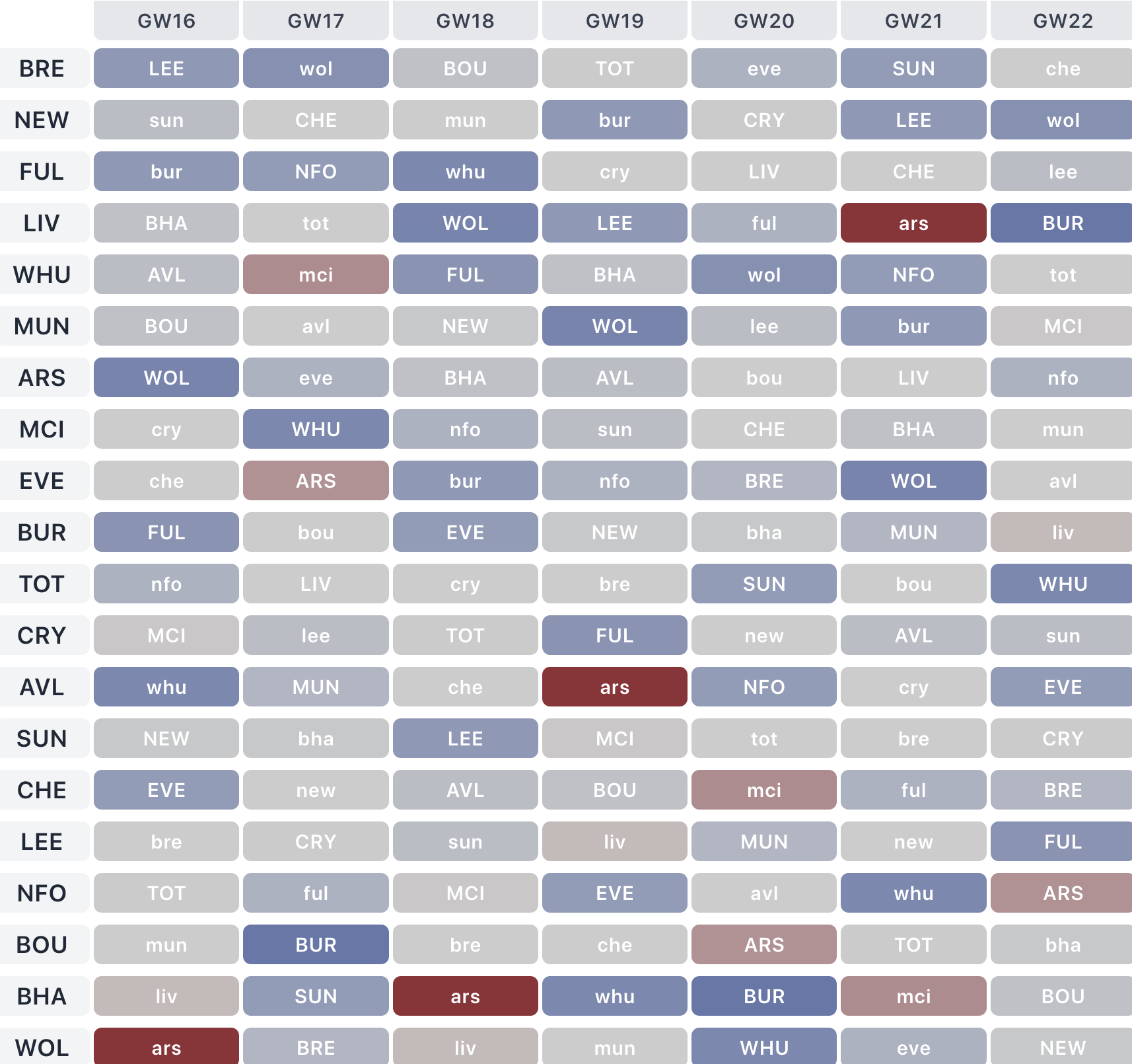 For planning purposes, here is the schedule sorted by difficulty for Match Weeks 16-22, which covers the entirety of AFCON.