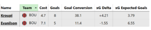 Kroupi has the best shot-on-goal conversion rate of any FPL striker this season (38.1%). He is also the first to overachieve xG (+4.21).