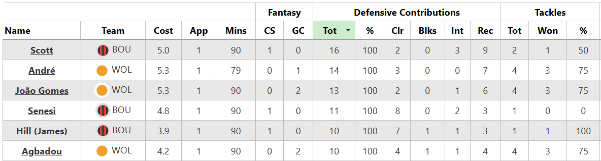 Budget purchases James Hill (£3.9m) start their sixth consecutive game together Mark Senesi (£4.8m) at centre-back. And, for the sixth straight game (he was improved to 10th, post-FPL-cut-off, in Gameweek 21!), Hill reached the DefCon threshold: